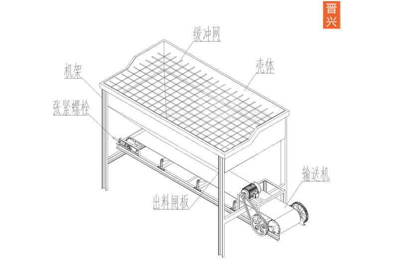 本產(chǎn)品作為物料加工過程中的原料倉使用,適用于鏟車裝填物料,出料時(shí)可實(shí)現(xiàn)勻速不間斷輸出,從而節(jié)省人工,提高工作效率。2.結(jié)構(gòu):該機(jī)由機(jī)架、殼體、緩沖網(wǎng)、輸送機(jī)組合而成。