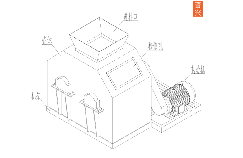 二、該機(jī)由進(jìn)料口、機(jī)體、出料口、轉(zhuǎn)子(包括軸承)、傳動(dòng)裝置及減振器組成。